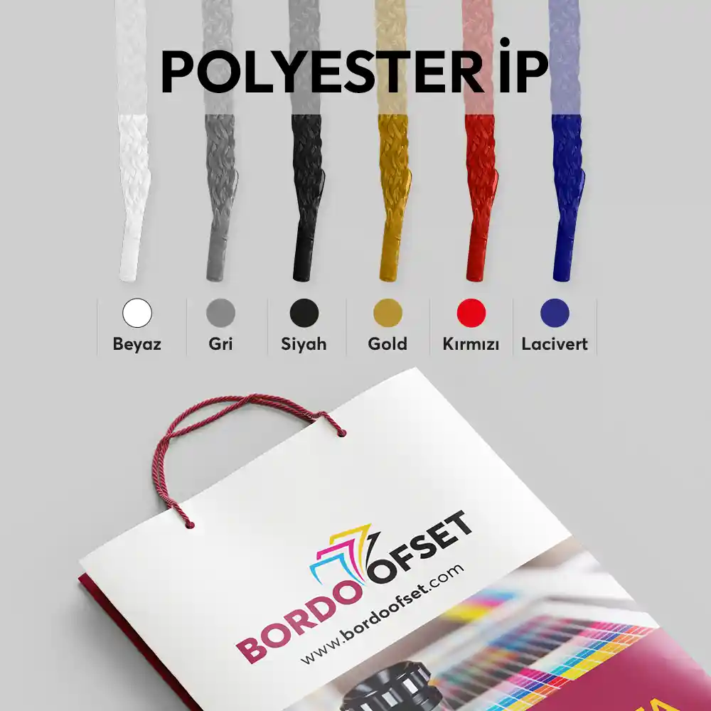 Karton çantalarda genellikle üç çeşit taşıma ipi kullanıyoruz. Polyester İp, Kurdele ve Grogren kurdele. Kullanılan malzemeler çantanın tasarımına ve kullanım amacına göre seçilmektedir. Her malzemenin ayrı ayrı renk kartelası bulunmaktadır. Devamı..